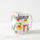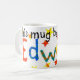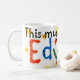 White mugg med texten "this mugg tillhörs to Edward" i färglös skrift gjord av handmålat pappert kollage.