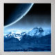 Den tuffa kratterplaneten ser ut över bergstoppen med måne.