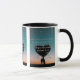 Denna tvåtonsskript i mugg innehåller "Ephesens 3:20"-bibelcitattskript KJV i ett bra med svart kontur i vit brev plus bibelcitat över en bild som visar en person som står bredvid ett träd med en hjärtformade topp under en kvällsvecka i himlar vid solnedgången i detta trosbaserade tema från Kung James-bibeln. Behållaren och fälgen är glaserade i motsvarande färg i 11 eller 15 uns stora mikrovågsugn och säker keramikkonstruktion av diskmaskiner.