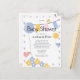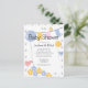 Den här söta babyduschen efter e-postinbjudan innehåller ballonger, fåglar, buntar och blommor i en blå och gult kombination. Vänstern kan anpassas till baby namn. . På motsatt sida finns en upprepad blå ballong mönster. Anpassa all information från produktsidan.