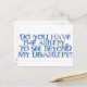 "Har du förmågan att se bortom mitt funktionshinder"? Många ställer frågan, men det är som om den ignoreras. Lägg ut det i klartext. Denna design finns på t-shirts, muggar, magneter, gifts- och mycket annat.