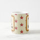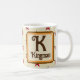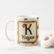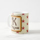 Detta monogram morgonte eller kaffe mugg är ett underbart sätt att tillföra en färgstark beröring till morgonrutinen. En elegant rosa och röd stjärna mönster visas mot en beige bakgrund. Brev "K" visas på en kvadrat tillsammans med familjen namn på båda sidor om mugg. Brev och ert namn kan snabbt och enkelt vara personlig. Ursprunglig design - C. McGouldrick