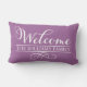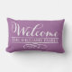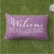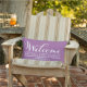 Utomhuskuddedesign för snyggt innehåller "Välkommen" i modernt, vitt skript med anpassningsbar namn-text och dekorativ dekorativ dekorativ dekorativ dekorativ dekorativ rulla. Den violetta lila-bakgrunden färg som kan anpassas till din dekoration.