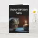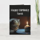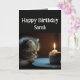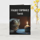 Anpassat namn för grattis på födelsedagen med en söt kattunge som stirrar på en cupkaka och ljus