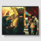 Egyptisk drottning med röd drake på axeln. Drottningen håller ett universum. En svart lejon med vingar ligger på ett berg med en sfinx bakom.