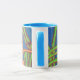Vit mugg med originalskrivet egyptiskt mönster, blått handtag och fälg