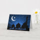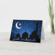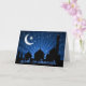 Eid Hälsning illustration med silhuetter av måne, stjärnor och moské på en blå natt himlar.