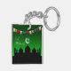 Eid Mubarak hälsningillustration med en festlig och färgrik girland i en magisk nattplats med en moskésilhouette och månen och stjärnorna på en grön natthimmel.