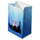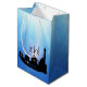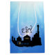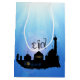 Svart silhuett av en moské på blå himmel med sol och solstrålning, hälsning och önskemål för Eid.