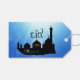 Svart silhuett av en moské på blå himmel med sol och solstrålning, hälsning och önskemål för Eid.