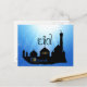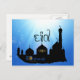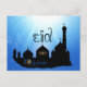 Svart silhuett av en moské på blå himmel med sol och solstrålning, hälsning och önskemål för Eid.