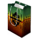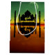 Eid Mubarak hälsningillustration: en moské och en handflatansilhouette på en bakgrund för natthimmel med månen och stjärnorna som reflekterar på vatten.