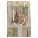 "Eiffel Torn Blommigt Paris Vintage Guld Script Ephemera Medium Gift Bag." A gräns av rullverket guld glitter avslutar översta kant. Ett svart och vitt sepiefärgat foto av Eiffel Torn med en turistbåt omges av rosa-hylsor, sädesdamm tapet och manushandskrift och typografi ephemera utgör en halvtegel upprepad mönster kring presentsäcken. All konst var grafisk designad av en internationellt licensierad konstnär och designör, Audrey Jeanne Roberts. Upphovsrätt.