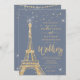 Ett modernt, chic och glamoröst romantiskt Paristema bröllop med fransken hand plockade guld glitter, Eiffel Torn med diamantgnistor från guld glitter på redigerbar dammblått. Perfekt för europeiskt destinationsbröllop.