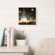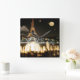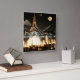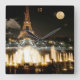 Den klassiska synen från Palais de Chaillot på natten. Torn står bakom belyst fontän medan ett stort måne tittar ner.
