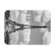 Ikonen Eiffel Torn är hög i Paris och fångad i ett svart och vitt foto.
