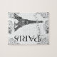 Svartvit illustration av scrollsarna Eiffel Torn och finare. Paris är skrivet i stark skrift på sidan. Fantastisk design för gåvor och kort.