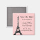 Smaklig twinkle ljus framhäver Eiffel Torn på detta parisiska inspirerade Spara datum magneter.