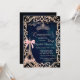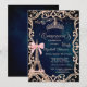 A modern, chic and glamorous invitation with an elegant gold tiara, Eiffel Tower with pink bow, and glitter butterflies on a navy blue background.