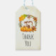 Tack för märkrn med en söt ekorre som står bakom några orange vattenfärgspumpor. En lövkrans omger dem med en ekblomma från löv och orange och andra sprit och löv. Bakgrunden är en kräm färg, med en grov åldras runt kant.