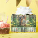 En ekorre står i en solbelyst skog, iförd en festlig födelsedagsmössa medan den håller ett födelsedagskort