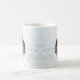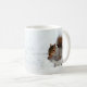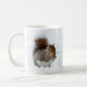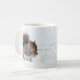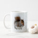 En söt, fuktig grått-ekorre sitter på anläggningen i snö och nibbar ett rött bär. Bilden skrivs ut på båda sidor om mugg. . Mugg stil, färg och storleka är anpassade.