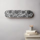 En skateboard med intressant och mångsidig abstrakt design som består av olika cirkelformade former i olika stilar som är sammankopplade med tunna linjer som ett nätverk eller ekosystem.