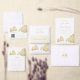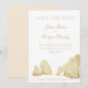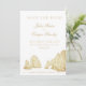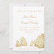 Denna Save the date-kort för destination bröllop har en teckning av den berömda bågen vid Lands End i Cabo San Lucas, Mexiko vid spetsen av Baja-halvön. Alla viktiga detaljer om bröllopet kan anpassas. Färgerna inkluderar en gyllene sepia tvåtons-grafik med matchande text.