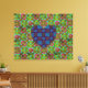 Ett vibrerande och intrikat mönster fyller utrymmet med ett blått hjärta omgivet av symmetrisk blommigt i grönt, rosa och bruna nyanser. Bakgrunden är ett enhetligt grått, där tonvikten läggs på den färgstarka tejpen.