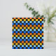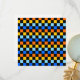 Ett livfullt schackbrädesmönster med alternerande rader av orange, gula, ljusblå och blåa rutor mot en svart bakgrund. Designen är djärv och energisk.