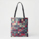Den här bilden är ett dynamiskt, geometriskt mönster med ett rutnät av fyrkanter i olika fet färg, främst rött, orange, lila, benvitt och svart. Varje kvadrat innehåller en hel cirkel (punkt) av ett kontrasterande färg, ge utseendet på färgstarkt polka dots inbäddat i en kvadratisk matris. Samspelet mellan cirkeln och fyrkantiga former skapar en dynamisk, rytmisk effekt som är synligt engagerande och energisk.