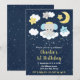 Den här söta och visuella inbjudan innehåller en berömvärd baby-elefant i ett guld krona sitta på ett moln med fallande stjärnor. I bakgrunden är det en stjärnnatt himlar och ett halvmåne måne. Texten kombinerar handskript och sans serif typsnitt för en snyggt och ett modernt utseende. Det här är perfekt för en födelsedagsfest.