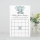 Söt könsneutral baby bingo shower game med "baby shower bingo" i en stilren mjuk grå skrift med svängar och en pastell mintgrön vattenfärg av en elefantunge