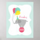 Denna affisch för barnkammaren har en illustration av en elefant som står på en rosa boll och bär en turkos hatt och håller tre ballonger i sin snabel. Kanten är ljus turkos. Personliggör namnet.