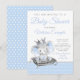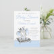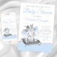 Elefant baby shower-inbjudningar med söt baby manlig elefant som bär en babyblå och silver krona sittande på en elegant silverfransad kudde på en babyblå och vit prickig bakgrund. Dessa elefant baby shower-inbjudningar kan enkelt anpassas för ditt evenemang genom att helt enkelt lägga till dina uppgifter. Du kan ta bort kronan, och du kan ta bort baksidans bakgrund om du föredrar det.