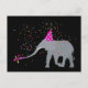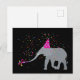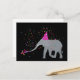 En söt illustration av en elefant som firar och har kul! Elefant som bär en födelsedags hatt och blåser i en festtuta med konfetti som regnar ner över den. Låt firandet börja! Perfekt för alla som älskar roliga djurillustrationer. Idealisk för ett födelsedags kort.
