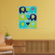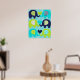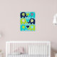 Elefantkärlek nursery affisch har sex elefanter i marinblå, turkosblå och limegrön med tryckt chevron-rand, blommor och prickiga öron på en blå och vit diagonalt randig bakgrund!