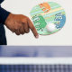 Det härliga seamless mönster av färgrika tecknadelefanter med skuggar att gå omkring över randar, i att lugna pastell, skuggar av orangegrönt- och blåttperfekten för ungerum som tapeten eller textilen. © och ® Bigstock® - all reserverad rättigheter.
