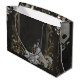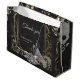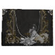 Elegance i silver och Black. Den här bilden visar en svart och vit illustration av ett bröllop ram med intrikata präglingar av guld och silver. Ram är kantat av ornitade blommönster och ett centralt arkeparti. En brud i en blommande gåva, som håller en bukett, står i ram, vänd bort från tittaren. Bakgrunden är ett texturerat svart yta som skapar en dramatisk atmosfär och elegant.