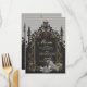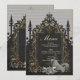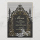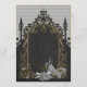 Elegance i silver och Black. Den här bilden visar en svart och vit illustration av ett bröllop ram med intrikata präglingar av guld och silver. Ram är kantat av ornitade blommönster och ett centralt arkeparti. En brud i en blommande gåva, som håller en bukett, står i ram, vänd bort från tittaren. Bakgrunden är ett texturerat svart yta som skapar en dramatisk atmosfär och elegant.
