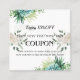 Lägg till en liten bit botaniskt kort till ditt företag med det här vackert designade kupongkortet på 15 %. Den här mallen innehåller mjuka vattenfärgssucculents och blommigtar och är perfekt för saloner, spa, boutiques eller vilket litet företag som helst som tittar att belöna lojala kunder. Det här snyggten är både professionell och inbjudande och är enkelt att anpassade till kostym.