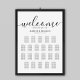 Den moderna planen för sätesschemat i bröllop poster med en snyggt vit bakgrund, "Välkommen" i ord i ett elegant-skript, namn, bröllop-datum och en bord 22 bröllop-platsmall.