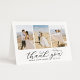 Ett fräscht och modernt bröllop tack-kort med tre parbilder sida vid sida i en landskapskollage-layout med ett elegant kalligrafiskt "tack"-manus nedan. Paret namn och bröllopsdatum är helt redigerbara för att anpassa din kort. Detta flerfotosformat är ett underbart sätt att visa dina favoritbröllopsögonblick. Det vikta kortets insida finns tillgänglig för en handskriven hälsning eller anpassad tryckt hälsning.