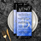 Lägg till sofistikering till 45:e safir bröllop-årsdagen firande med den här middagsmenyn, som innehåller elegant och sexkantig konetti på safierblått och svart bakgrunder. Anpassa med parets namn, data i giftermål, platsinformation, menyalternativ och gratulationsmeddelanden. Design © W.H. Sim. Se mer på zazzle.com/expressionsoccasions