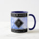 Högtidlighålla den 45:e safir-årsdagen för bröllop med detta minnesmärke mugg. Elegant med vita bokstäver med hexagonala konfetti på safir blå bakgrund lägger till ett minnesvärt tryck för detta speciella tillfälle och extraordinära milstolpe. Anpassa med parets namn och år av giftermål. Design © W.H. Sim, Med reserverade Höger. Se mer på zazzle.com/expressionsoccasions