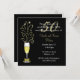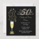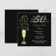 Chic femtioårs bröllopsjubileumsfestinbjudan, utförd i svart och guld. Grafik av ett festligt glas champagne dekorerat med en guldtonad slinga på skaftet och gnistor som kommer ut ur toppen, pryder vänster sida av den svarta inbjudan. Vit och guldtonad text är helt anpassningsbar för att passa dina evenemangbehov.