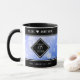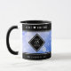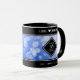 Högtidlighålla 65ens bröllop-årsdag med detta högtidlighållande av mugg. Elegantens svarta serif och sans serif-bokstäver med hexagonala konfetti på blå safir-bakgrund tillför ett minnesvärt tryck för detta speciella tillfälle och extraordinära milstolpe. Anpassa med lycklig parets namn. Lägg till ännu mer anpassning med ett datum för den blå safiannummen. Design © W.H. Sim, Med reserverade Höger. Se mer på zazzle.com/expressionsoccasions