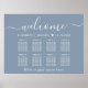 Elegantens nedladdningsbara stoftblått bröllop-sätesdiagram poster tecken för upp till 8 bord som är "välkommet" i ett chic vitt skript med dekorationer, namn och bröllop-datum gått med av ett hjärta och "Vi är så glada att du är här" i klassisk vit serif-typografi. Du kan välja det digitala nedladdningsalternativet om du vill redigera med ändringar i sista minuten och skriva ut lokalt.