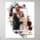 Elegant akvarell vinröd rosa blomster- och grönsaklig bride- och brudgumme bröllopsfototavla med vinröda och rosa rosor, blå blommor, botanisk grönska och eukalyptusblad.