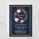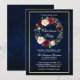 Elegant akvarell blå bakgrund med akvarell burgunder Marsala blomsterkrans julfest inbjudan. Inkluderar vackra rosor och botanisk grönska. Guld ram.